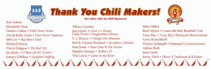 We have 25 chili makers, including: O’Shea’s, Geraldine’s Kitchen, Pearl Street Taphouse, Red Yeti, Game on the River, Papu Chos at The Alcove, Bubbas 33, Schimpff’s Confectionery, Harry’s Taphouse & Kitchen, the Louisville Bats, & many more!
