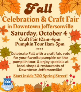 Join us this Saturday, October 4 for the Fall Celebration & Craft Fair in Downtown Jeffersonville! Start at 300 Spring Street for the craft fair and get your passport for the pumpkin tour (where you’ll get to vote for your favorite pumpkin decorated by downtown shops), post online from the selfie banners, and enjoy Fall specials & sales in local restaurants & shops on Spring Street, Pearl Street, Maple Street, & adjacent streets. Start at 300 Spring Street – admission to craft fair and pumpkin tour are both FREE.