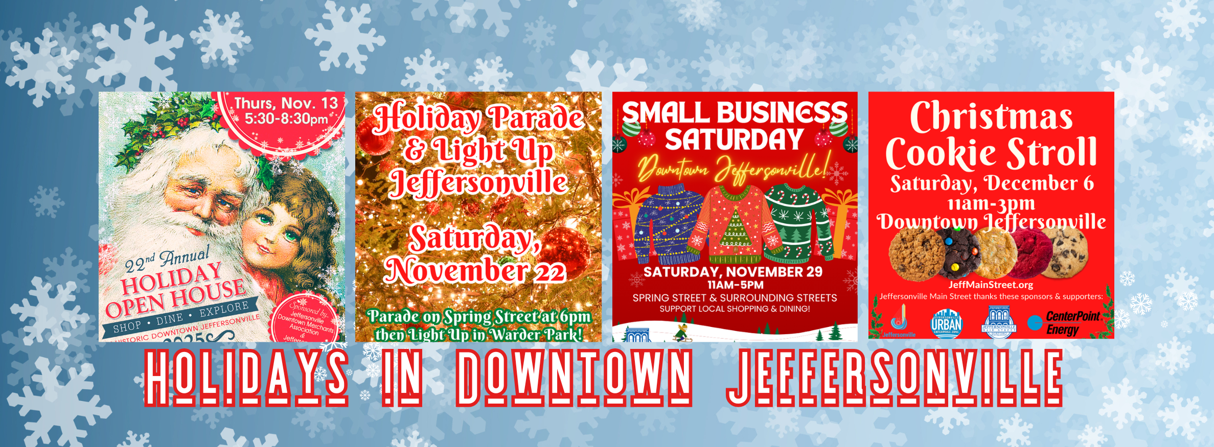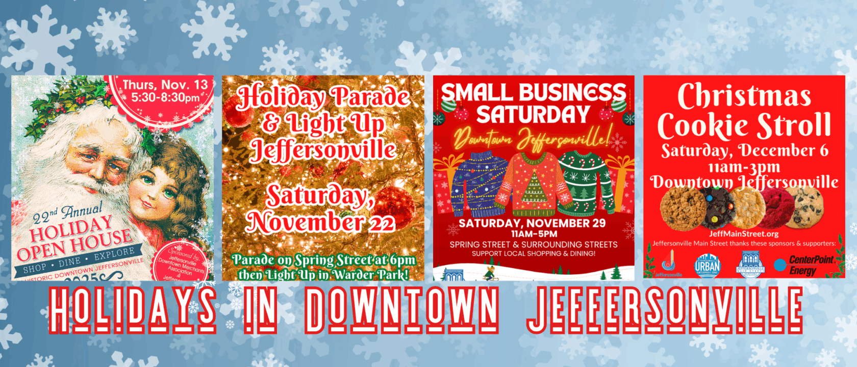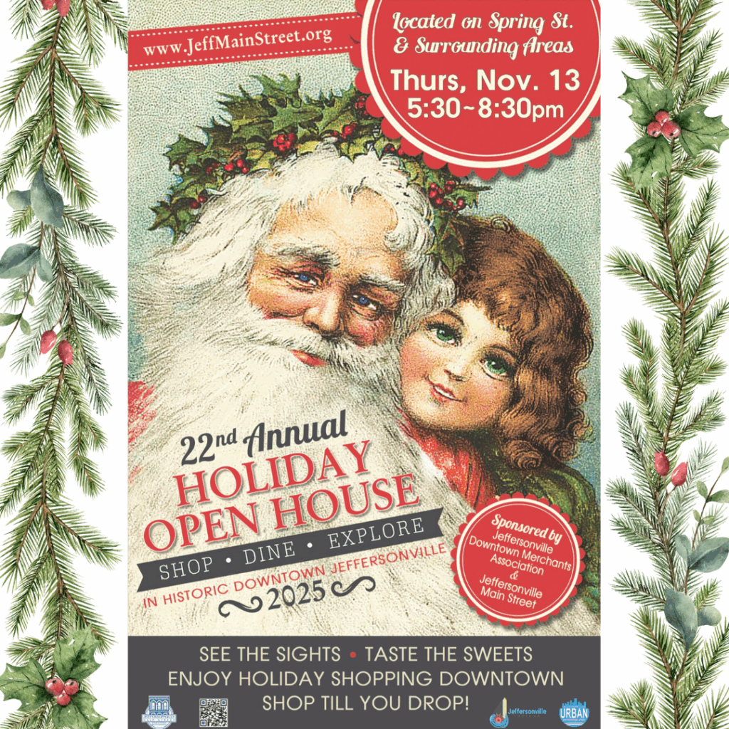 Downtown Jeffersonville — Enjoy holly, jolly, local shopping & dining at the Holiday Open House on Thursday, November 13, 2025 in Historic Downtown Jeffersonville, Indiana. Participating businesses will offer holiday specials during this event and there will also be awesome give-aways during that time. The Holiday Open House hours will be 5:30pm-8:30pm.
