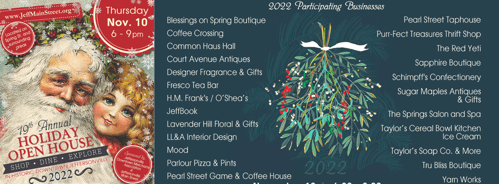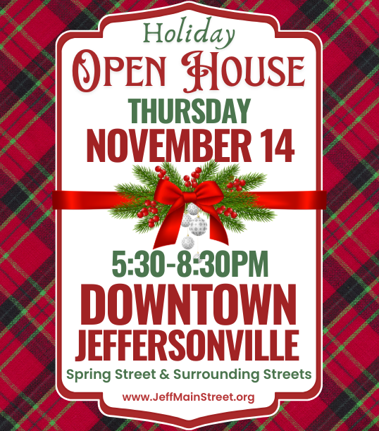 Downtown Jeffersonville — Enjoy holly, jolly, local shopping & dining at the Holiday Open House on Thursday, November 13, 2025 in Historic Downtown Jeffersonville, Indiana. Participating businesses will offer holiday specials during this event and there will also be awesome give-aways during that time. The Holiday Open House hours will be 5:30pm-8:30pm.