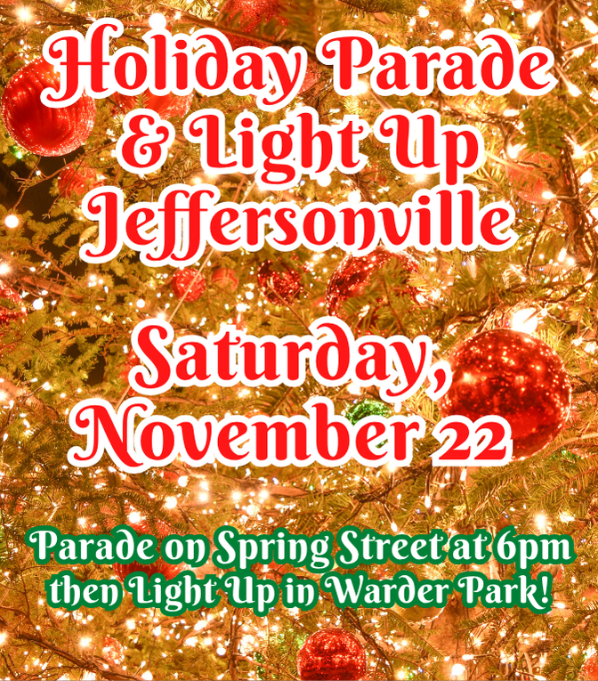 Jeffersonville’s Holiday Lights Parade is Saturday, November 22 at 6pm on Spring Street (between Market Street and Warder Park). The parade is followed by Light Up Jeffersonville in Warder Park at 7pm!