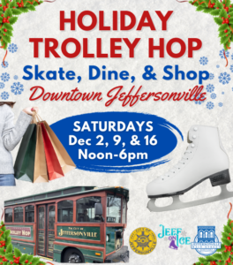 Make a holly, jolly day of it in Historic Downtown Jeffersonville! Enjoy FREE trolley rides throughout our historic district that gives you easy access to hop off and do some holiday shopping & dining at local small businesses on these Saturdays from Noon-6:00pm: Dec 2, Dec 9, & Dec 16. We’ll have live music on the trolley and everyone is encouraged to sing along to their favorite holiday songs!
