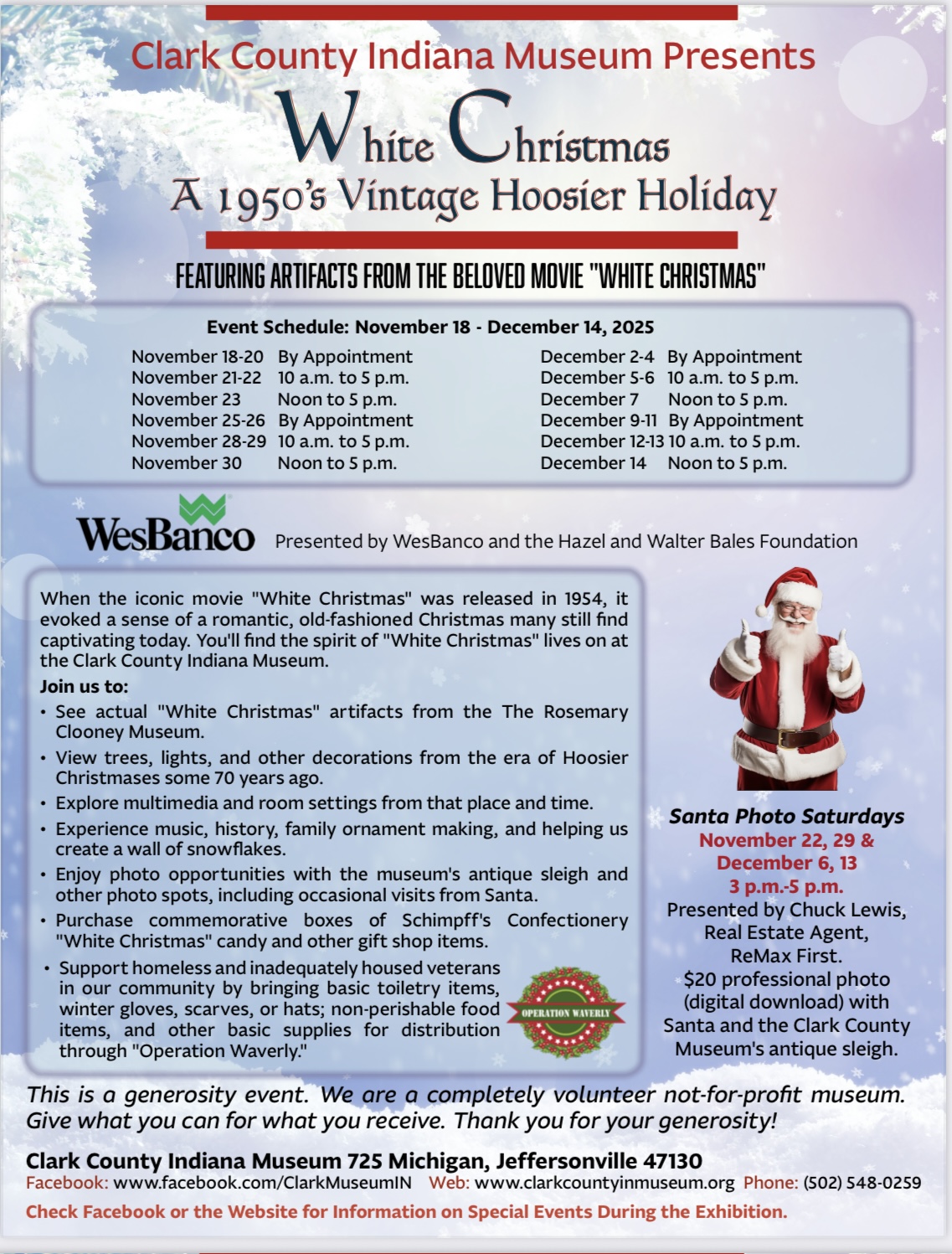 Come to the Clark County Museum in Historic Downtown Jeffersonville, Indiana to see a vintage 1950’s Hoosier Christmas! The museum has several items on display from the classic movie “White Christmas,” plus they have lots of other vintage Christmas displays set up that will give the whole family a nostalgic feeling. The museum also has photos with Santa Claus and several other activities planned. Go to the museum website for more info: News and Events – Clark County Indiana Museum