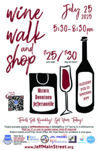 We hope to see you at the 16th Annual Wine Walk & Shop event on Friday, July 25 in Historic Downtown Jeffersonville! The event will go from 5:30pm-8:30pm and is hosted by Jeffersonville Main Street Inc., a nonprofit downtown revitalization organization, and the merchants of Downtown Jeffersonville. This event features 15 wine tasting stations and a variety of hors d’oeuvres located at the downtown shops. There will be five live music acts on the sidewalks, and special sales at our locally-owned shops. TICKETS ARE $25 PER PERSON IN ADVANCE AND $30 DAY OF THE EVENT.
