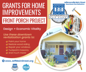 Jeffersonville Main Street encourages the preservation and restoration of homes in Downtown Jeffersonville to improve the livability and look of the area. Well maintained homes lead to pleasant and inviting neighborhoods, pleasant and inviting neighborhoods are essential to making Downtown Jeffersonville a vibrant place that people want to call home. The Front Porch Project helps with this endeavor! It is a matching grant program that will assist property owners in preserving, restoring, and rehabilitating homes within the grant coverage area (see map below). Grants are limited to exterior preservation, restoration or rehabilitation of homes. Read the guidelines below for more information.