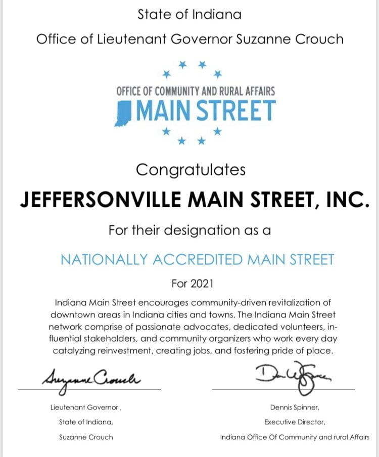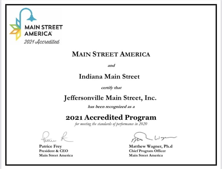 Jeffersonville Main Street, Inc. has been designated as a Nationally Accredited Main Street program for meeting rigorous performance standards in downtown revitalization. The nonprofit organization made the 2021 list of Main Street America’s accredited programs for its exceptional commitment to preservation-based economic development and community revitalization.